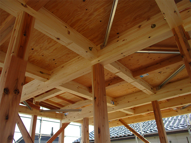 1階、2階ともに、910mmピッチで縦横に張り巡らせた構造材に、24mm厚の構造用合板を直接貼ることで、ねじれを押え、一般的な在来工法の数倍の強度を実現しています。