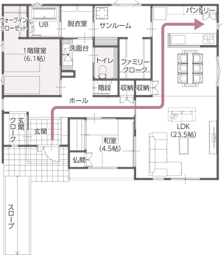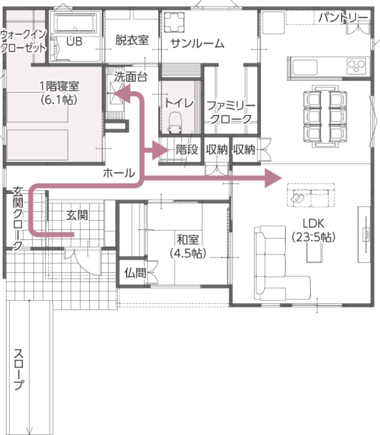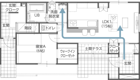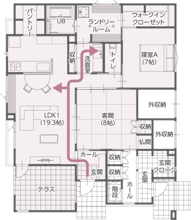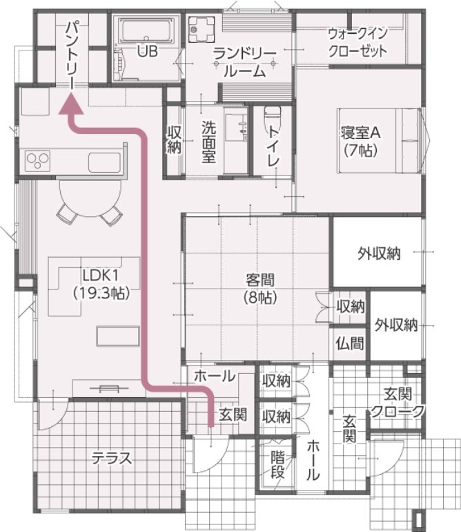 例えば玄関からキッチンまでは、リビングを通る道とトイレの前を通る道…、状況によって使い分けができます。