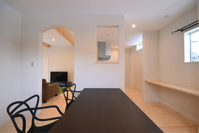 1階の壁は、石灰岩を原材料とした自然素材の塗り壁材です。自然素材ならではの調湿性で、人と住まいにやさしい健康増進住宅を実現します。また、光のアクセントによってもたらされる陰影が、更なる心地よさ、落ち着きを与えてくれます。