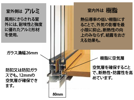 冬の冷気や、夏の暑気が最も入りやすい窓には、複層ガラスを備えたアルミ+樹脂アングルサッシを採用。 高い断熱性を実現し快適な居住空間を実現するほか、住まいの大敵、結露を大幅に抑えます。