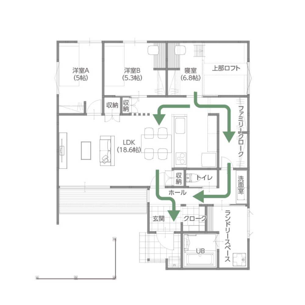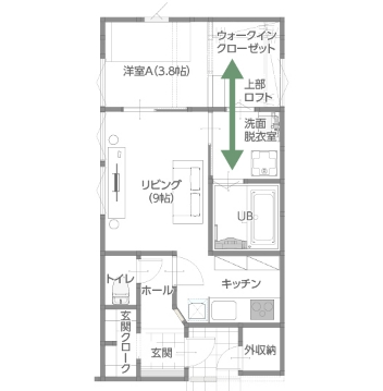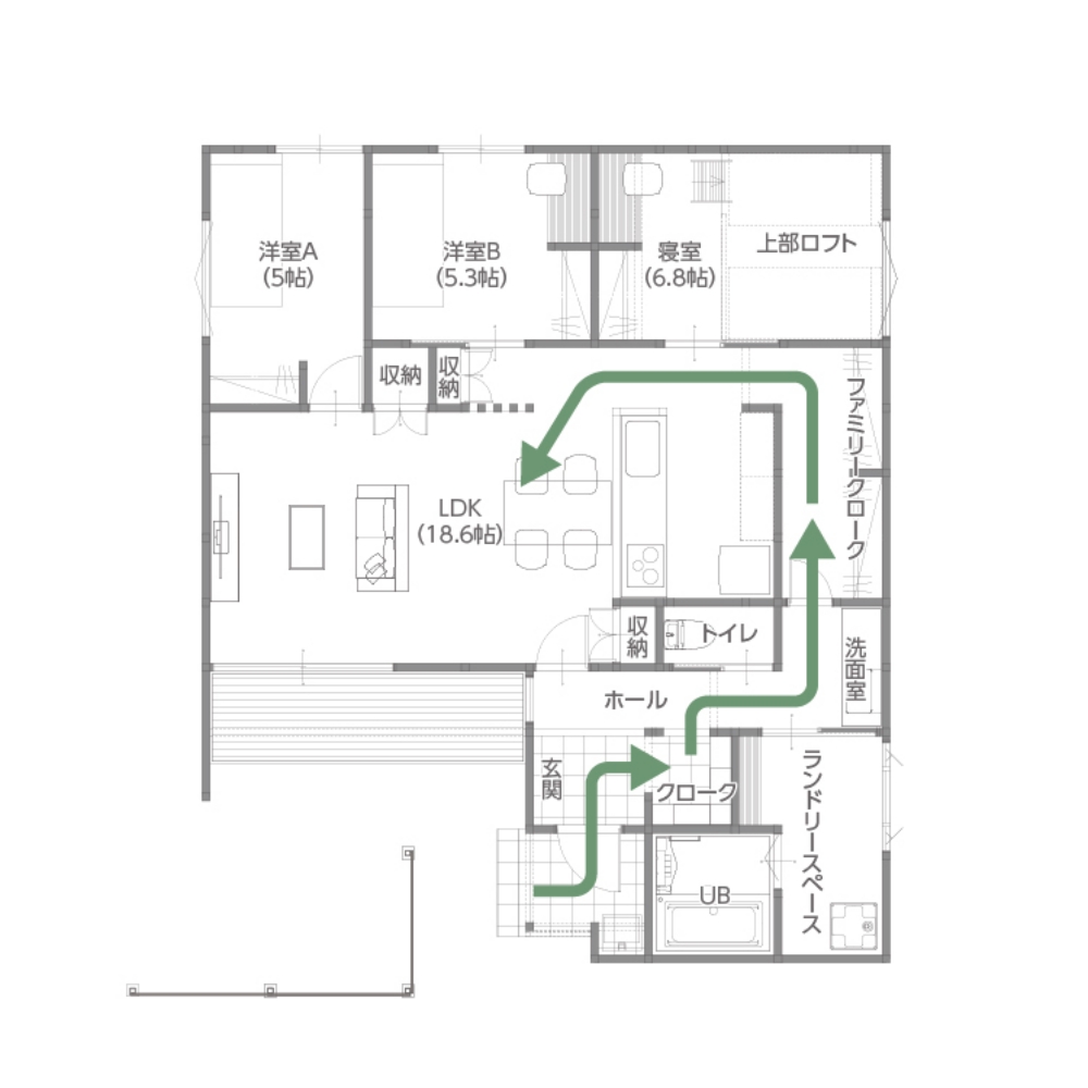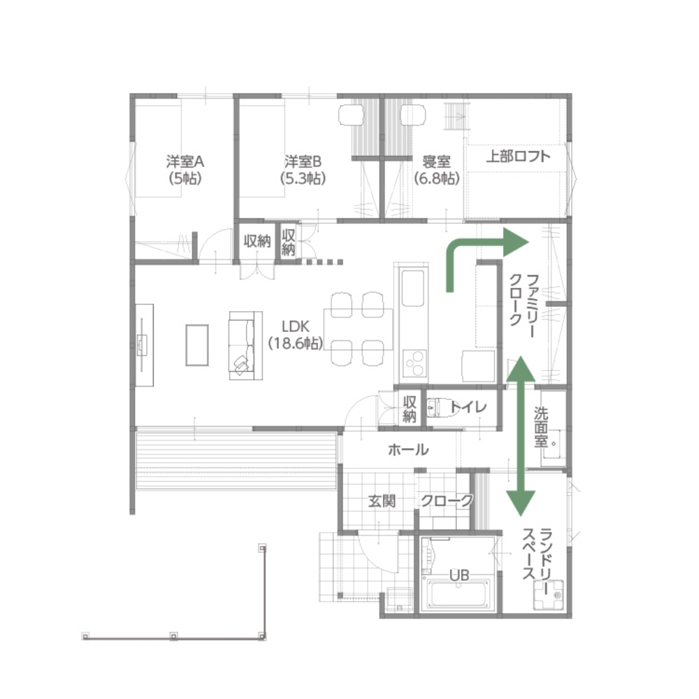 寝室には勾配天井を利用した便利なロフトを用意。リモートワークや収納スペースとして活用できます。